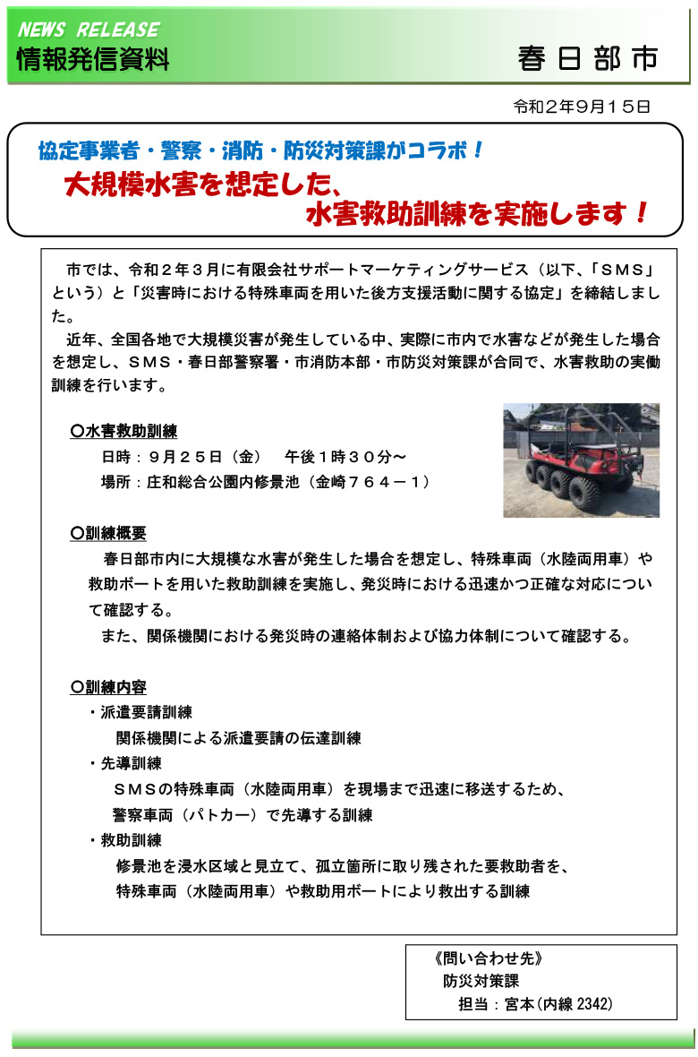 春日部市と令和2年3月に「災害時における特殊車両を用いた後方支援活動に関する協定」を締結したSMSが、9月25日(金)午後1:30より、実際に市内で水害などが発生した場合を想定し、SMS・春日部警察署・市消防本部・市防災対策課が合同で、水害救助の実働訓練を行います。