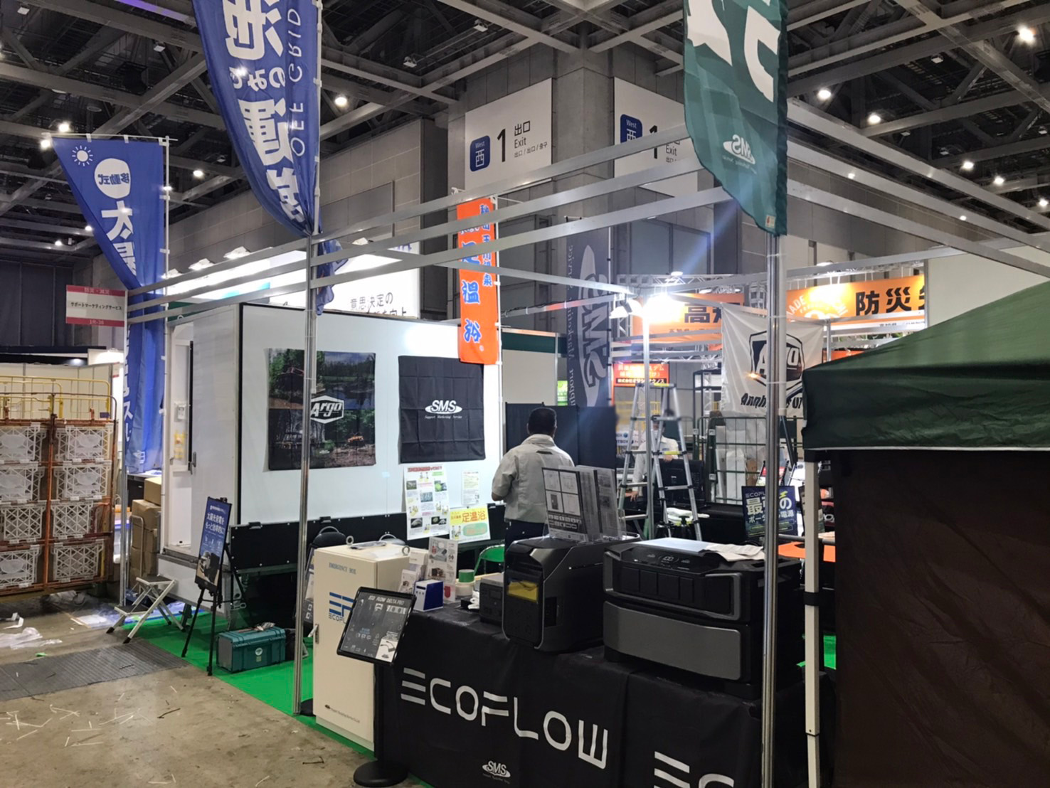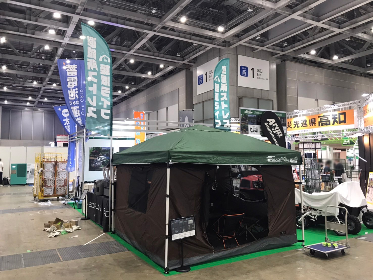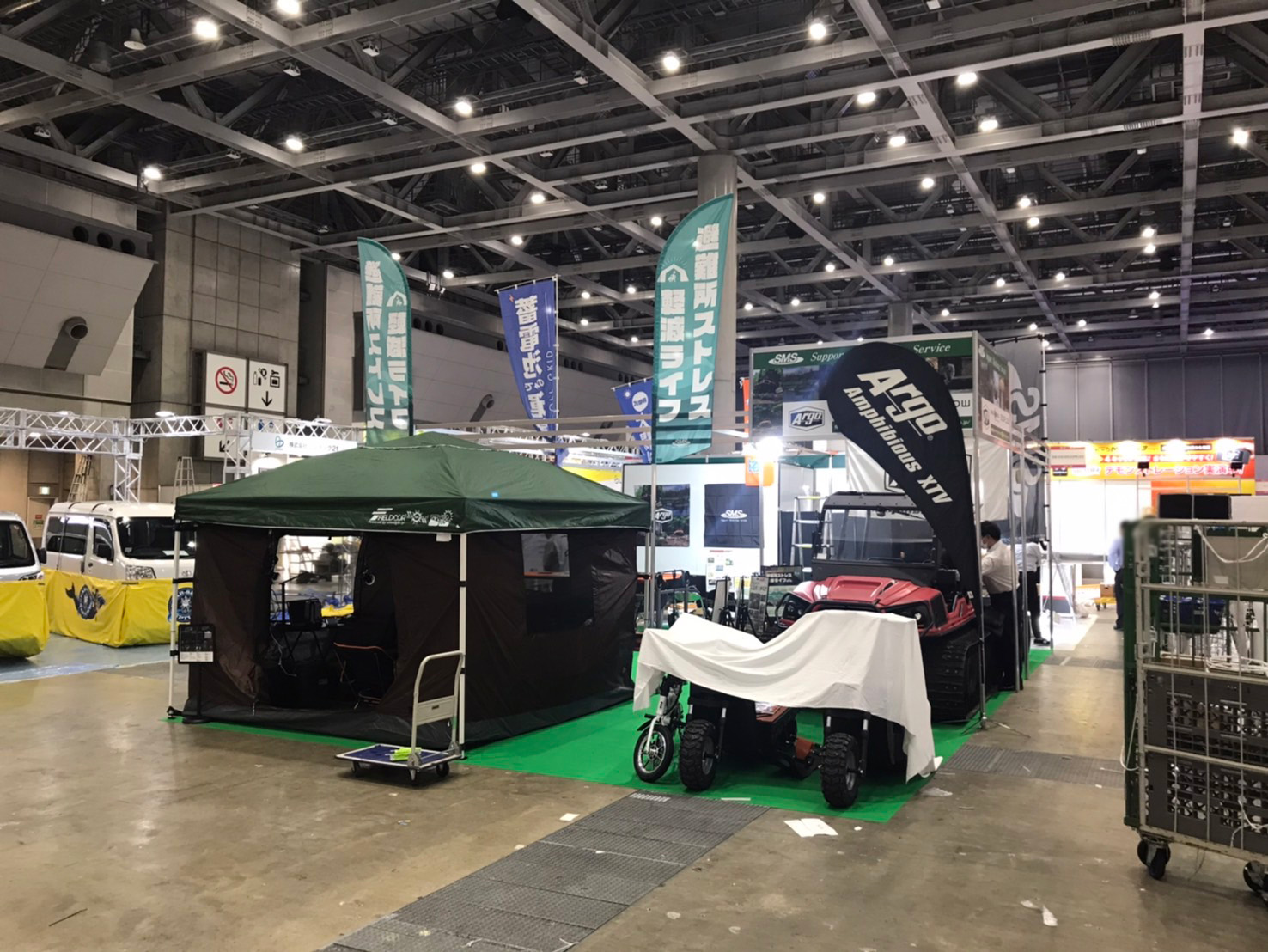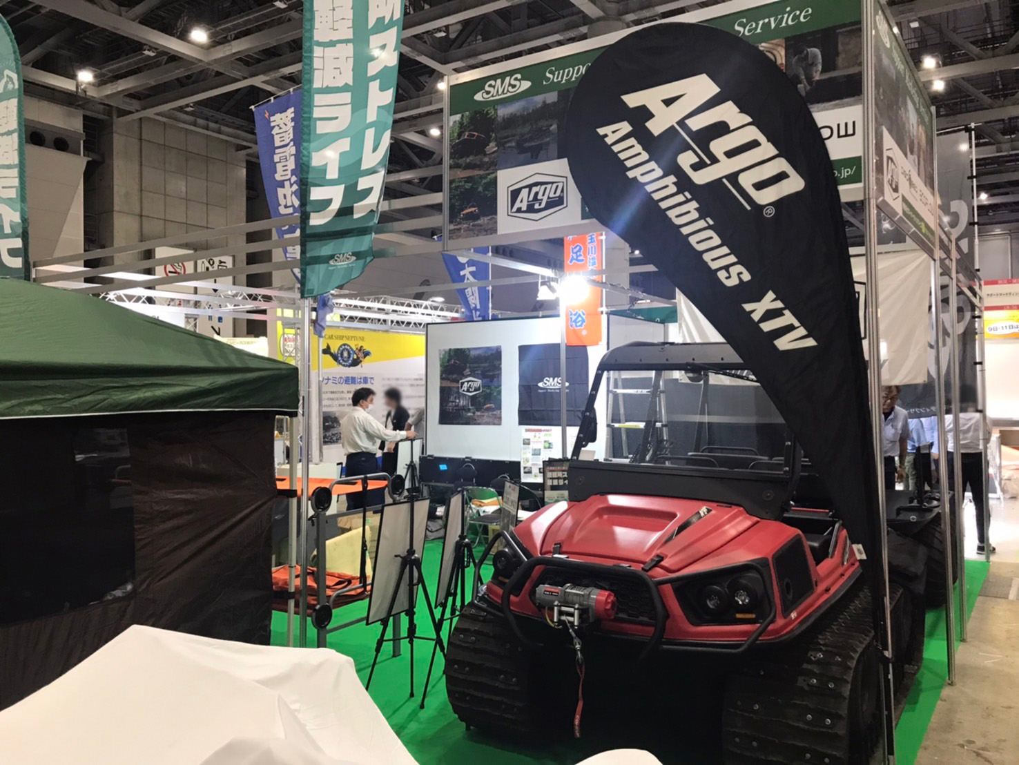 水陸両用車 ARGOの展示をはじめ、エネルギー事業部からは移動式小型太陽光発電システム「エネトレ」や「EcoFlow」、また大規模災害に備え、避難所生活において便利な防災グッズをセットにした「避難所ストレス軽減ライフ」等の展示もございます。