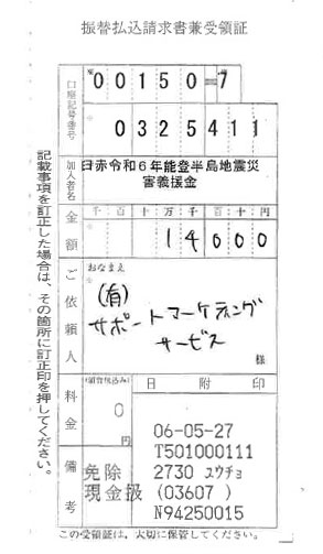有限会社サポートマーケティングサービスは、5月25日(土)・26日(日)にレイクタウン防災フェスで実施した水陸両用車体験試乗の売上の一部を、5月27日(月)に、日本赤十字社を通して能登半島地震の被災地に義援金14,000円寄付しました。