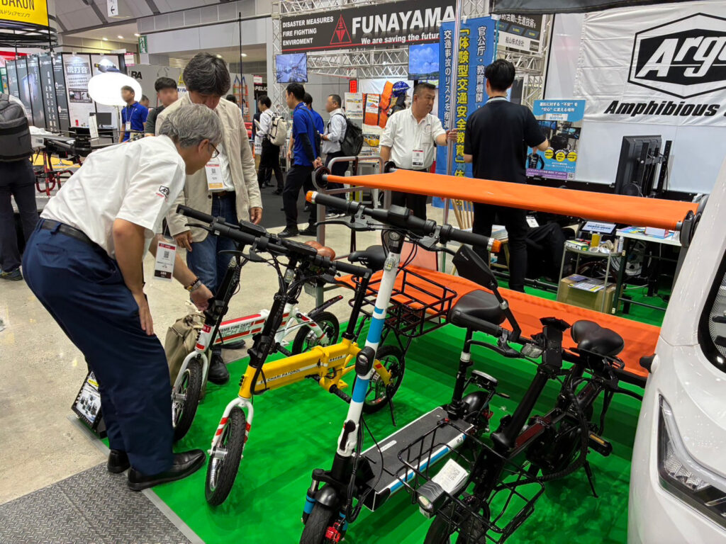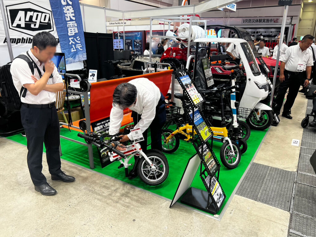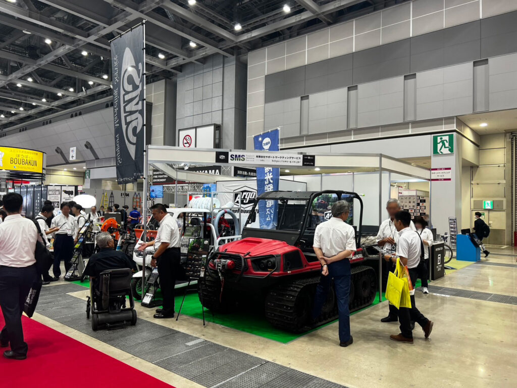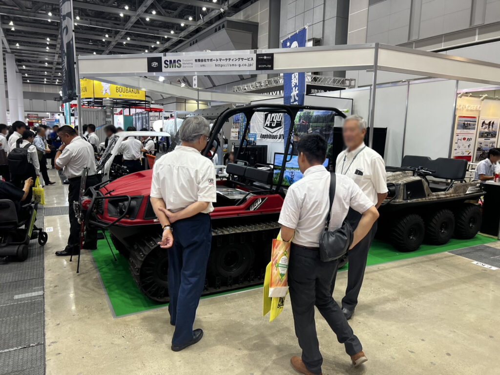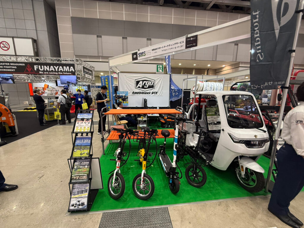 水陸両用車 ARGOの展示をはじめ、エネルギー事業部から移動式小型太陽光発電システム「エネトレ」や、EV事業部から電動バイク、電動キックボード等を展示しました。