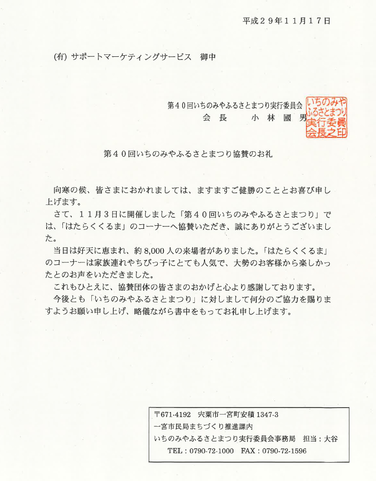 11月3日(金)に兵庫県宍粟市で開催されました「第40回いちのみやふるさとまつり」にARGOを展示しました! calendar_today 2017年11月3日 11月3日に兵庫県宍粟市にて開催の「いちのみやふるさとまつり」にARGOを展示しました! 会場:スポニックパーク一宮 Skip to PDF content