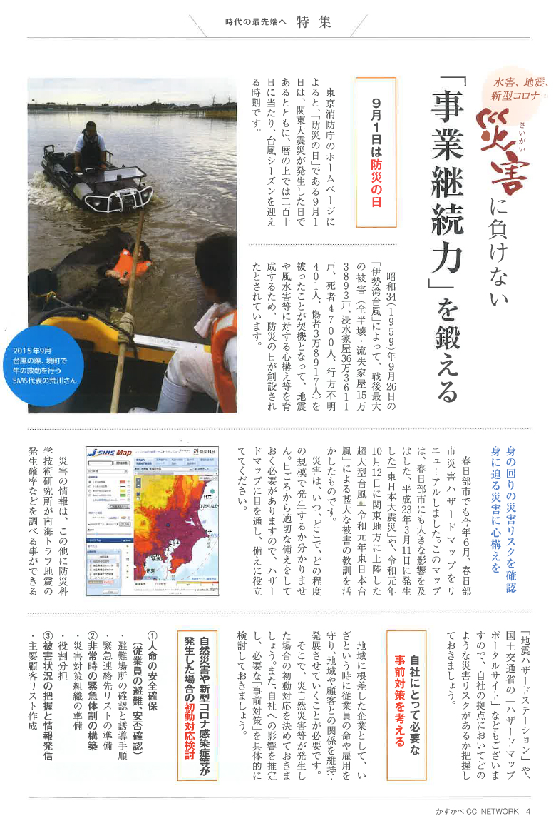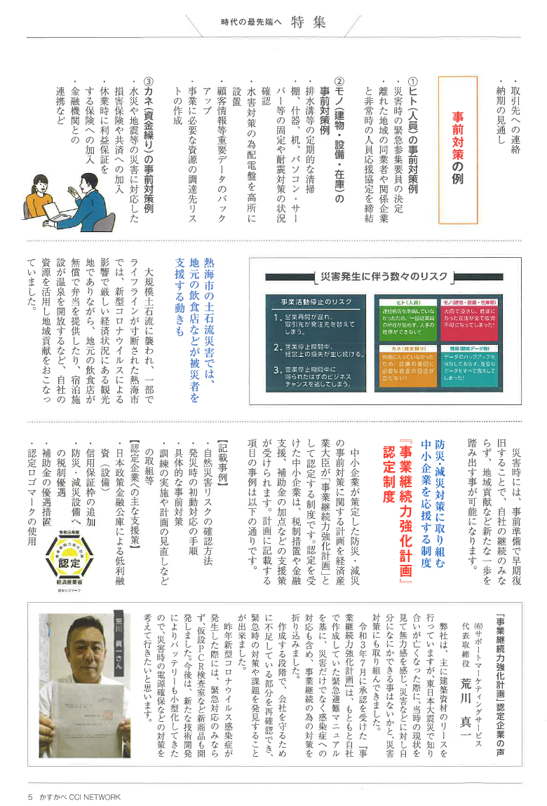 春日部商工会議所会報(2021年9月号)、「災害に負けない「事業継続力」を鍛える 」特集の中で「事業継続力強化計画認定企業の声」として弊社代表の荒川の記事が掲載されました。
