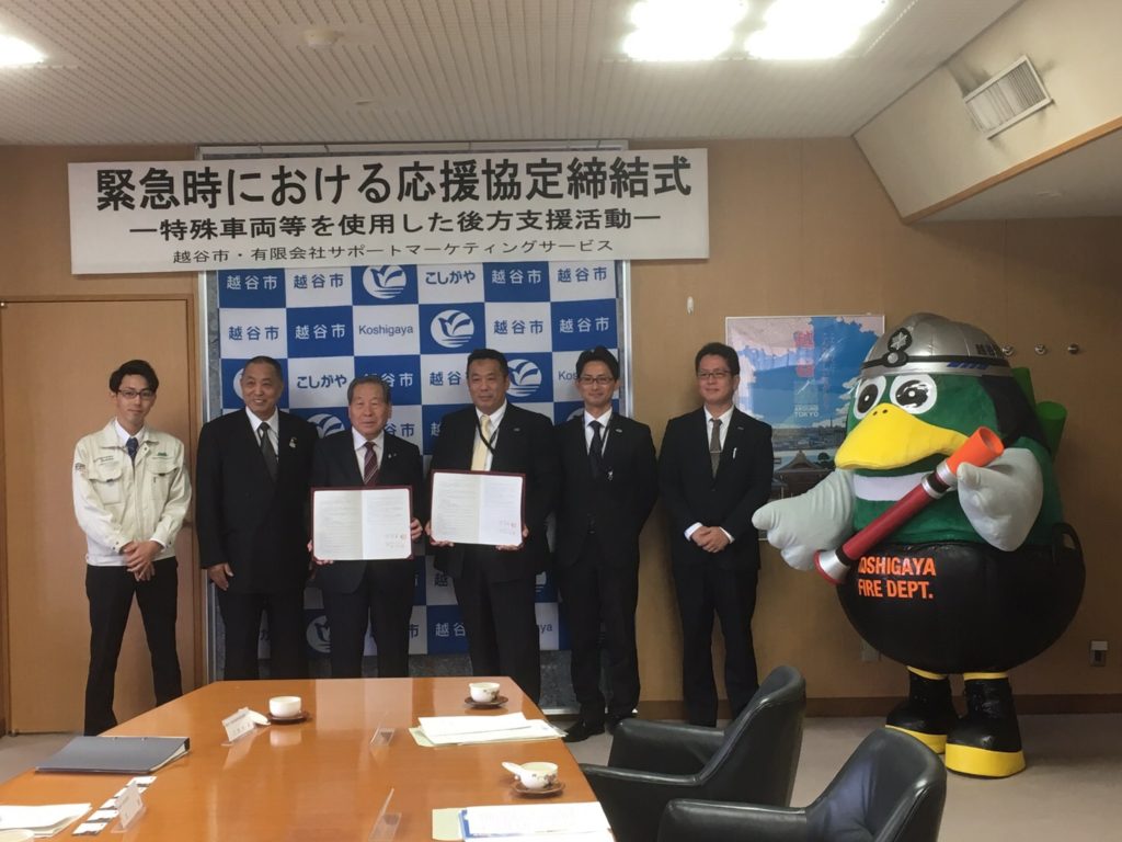 埼玉県越谷市と災害時等に越谷市の要請でARGOによる後方支援を行うための「緊急時における後方支援活動に関する協定」を締結しました。 calendar_today 2017年10月6日 2017年10月6日に埼玉県越谷市と有限会社サポートマーケティングサービスが「緊急時における後方支援活動に関する協定」の締結式を越谷市役所で行いました。 この協定は、埼玉県越谷市で災害などの緊急時に、越谷市の要請により有限会社サポートマーケティングサービスが水陸両用車ARGOを利用した後方支援活動を行うと言う内容となっています。