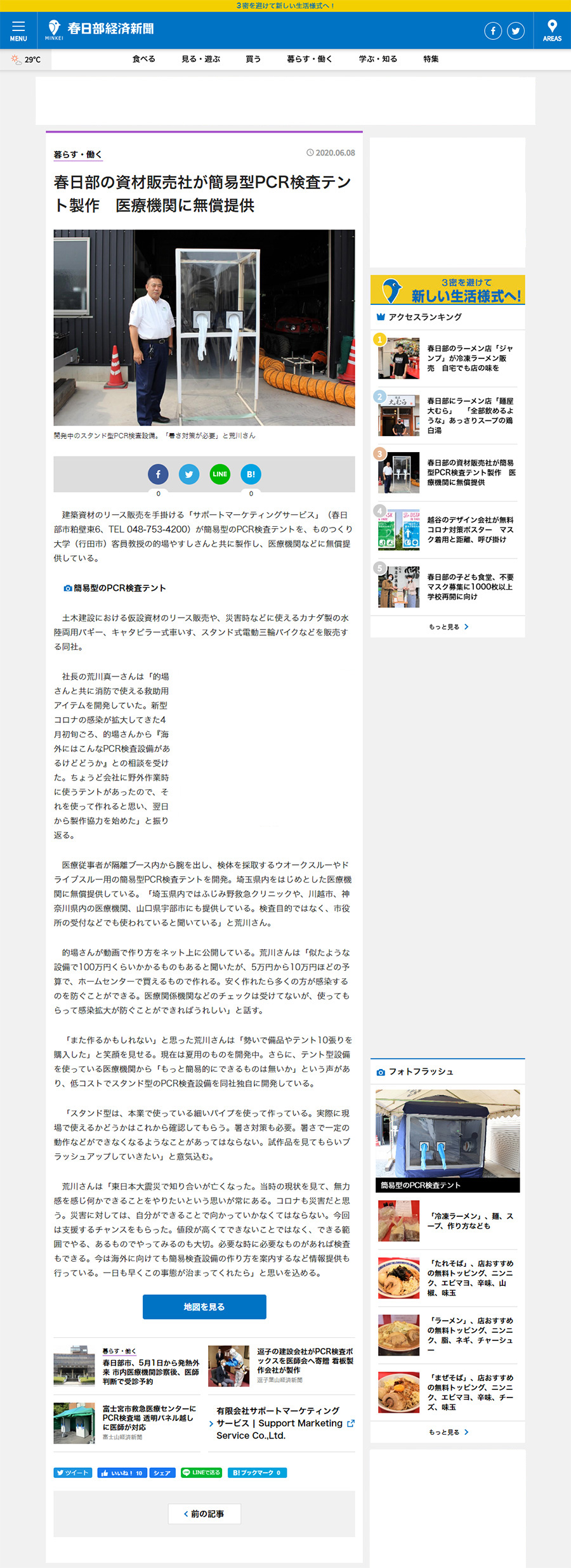 春日部経済新聞にて、弊社が開発した新型コロナウイルス スタンド型のPCR検査設備の記事が掲載されました。