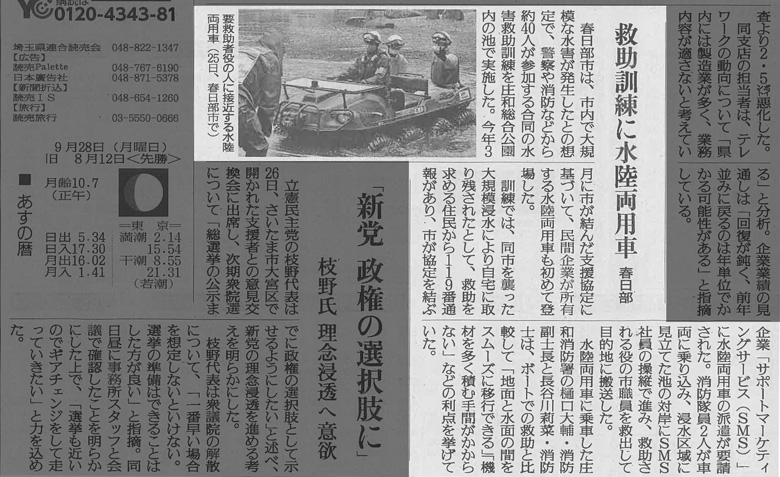 9月25日に春日部市で春日部市、警察、消防、弊社が合同で行った「大規模水害を想定した救助訓練」でARGOを使った様々な訓練を行いました。 calendar_today 2020年9月25日 2020年9月25日(金)に春日部市と警察、消防と合同で春日部市の庄和総合公園内修景池で大規模水害を想定した救助訓練を行いました。 春日部市と「災害時における特殊車両を用いた後方支援活動に関する協定」を締結している弊社はARGOで訓練に参加し水害救助の実動訓練を行いました。 また、当日の様子は読売新聞 埼玉版(2020年9月27日付)に掲載されました。 当日の様子(読売新聞 埼玉版 2020年9月27日付) 当日の様子(写真)