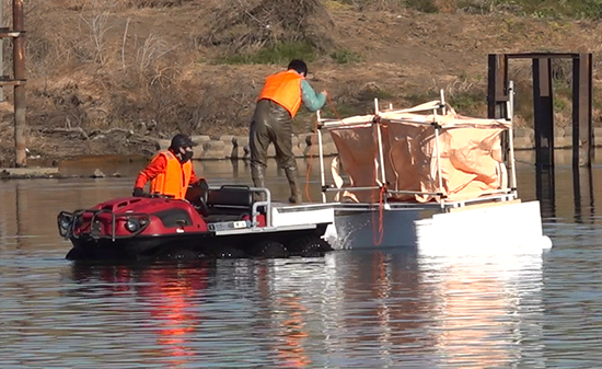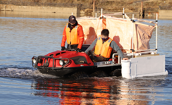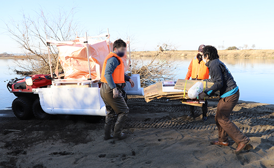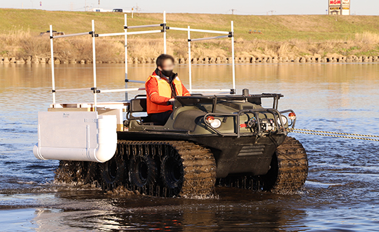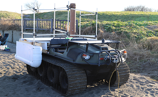 2022年1月22日(土)に千葉県野田市関谷城付近で実施された、長崎大学のマリー・ジョン・ローン先生が考案した水陸両用車を用いた海ゴミ回収支援設備の実証実験で、