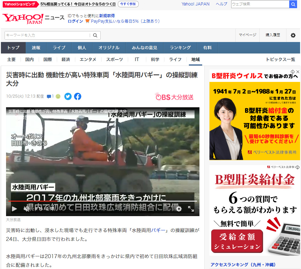 10月24日に大分県日田市で日田玖珠広域消防組合が実施した操縦訓練を報じたYahoo!ニュースでARGOが紹介されました。 calendar_today 2022年10月24日 10月24日(月)に大分県日田市で日田玖珠広域消防組合が実施した操縦訓練を報じたYahoo!ニュースでARGOが紹介されました。 水害の発生を想定し、急な坂や段差、浸水したコースなどを走行する訓練にて車両が使用されました。 Yahoo!ニュースの記事はこちら